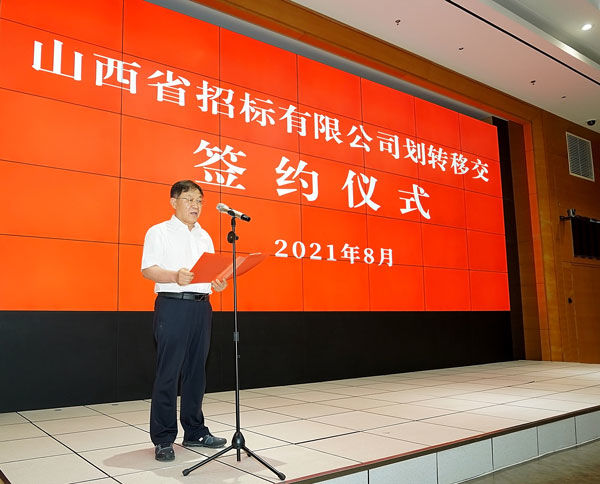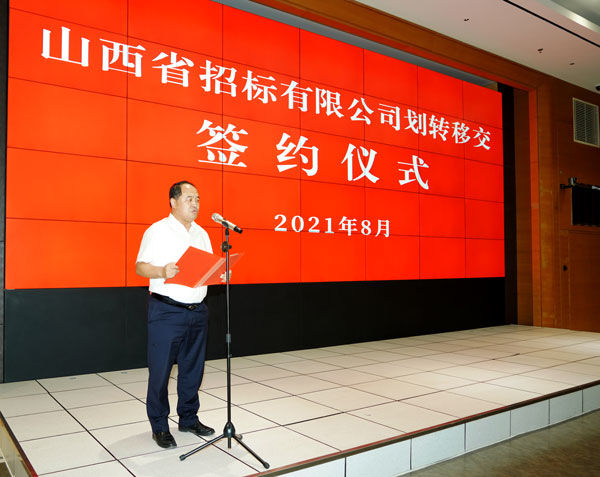 8月5日下午,由山西省行政審批服務(wù)管理局與省機(jī)關(guān)事務(wù)管理局舉辦的山西省招標(biāo)有限公司劃轉(zhuǎn)移交簽約儀式,在省政務(wù)服務(wù)中心報(bào)告廳隆重舉行。省行政審批局局長(zhǎng)李東洪及班子成員、省機(jī)關(guān)事務(wù)局毛益民局長(zhǎng)及班子成員、后勤體制改革領(lǐng)導(dǎo)小組改革專班負(fù)責(zé)人崔志明、晉勤集團(tuán)董事長(zhǎng)楊文治及班子成員、省行政審批局、省機(jī)關(guān)事務(wù)局相關(guān)處室負(fù)責(zé)人出席儀式,晉勤集團(tuán)、省招標(biāo)公司相關(guān)工作人員參加儀式。