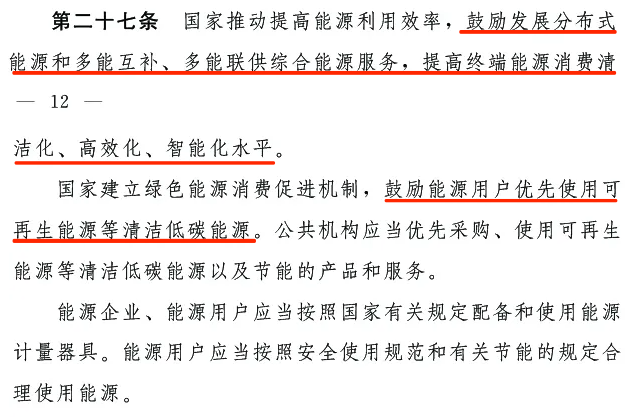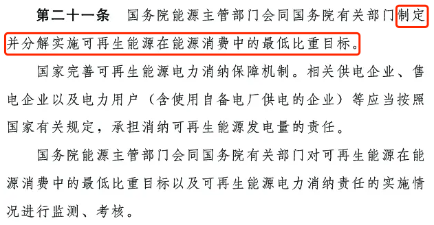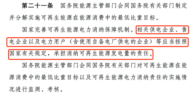 第二十一條:國(guó)家完善可再生能源電力消納保障機(jī)制。相關(guān)供電企業(yè)、售電企業(yè)以及電力用戶(hù) (含使用自備電廠供電的企業(yè))等應(yīng)當(dāng)按照國(guó)家有關(guān)規(guī)定,承擔(dān)消納可再生能源發(fā)電量的責(zé)任。國(guó)務(wù)院能源主管部門(mén)會(huì)同國(guó)務(wù)院有關(guān)部門(mén)對(duì)可再生能源在能源消費(fèi)中的最低比重目標(biāo)以及可再生能源電力消納責(zé)任的實(shí)施情況進(jìn)行監(jiān)測(cè)、考核。