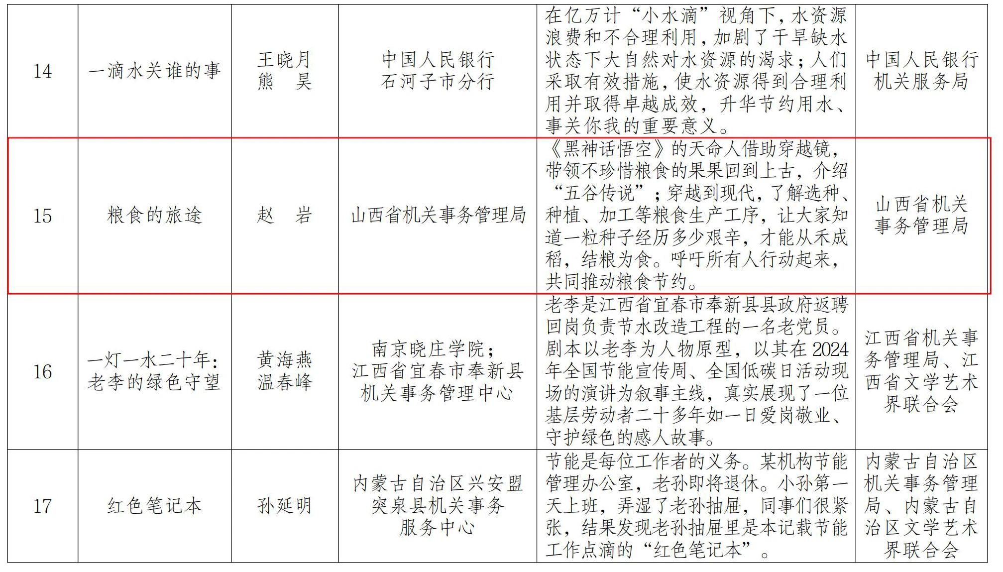 近日,國(guó)管局辦公室、中國(guó)文聯(lián)辦公室組織的2024年公共機(jī)構(gòu)節(jié)能主題優(yōu)秀劇本和故事征集活動(dòng)結(jié)果揭曉,山西省機(jī)關(guān)事務(wù)管理局選送的劇本《糧食的旅途》入圍優(yōu)秀劇本獎(jiǎng)項(xiàng)。